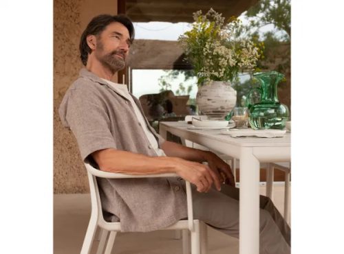 Líneas fluidas y pulidas para el taburete de una sola pieza Net Stool de resina de fibra de vidrio propuesto en seis elaborados y polivalentes colores con efecto mate. Decorado con un motivo especial de agujeros cuadrados, leitmotiv de toda la colección Net.