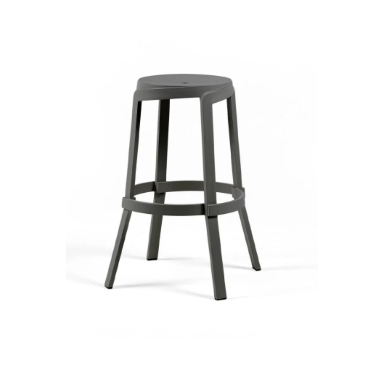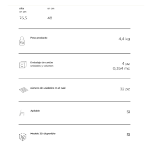 Material: polipropileno fiberglass regenerado tratado anti-UV y teñido en masa. Efecto mate. Con tapones antideslizantes. Altura asiento 76,5 cm. Resina reciclable.